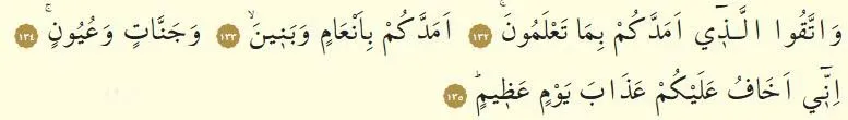 132-134. Ayet: "Bildiğiniz her şeyi size veren, size hayvanlar, oğullar, bahçeler ve pınarlar veren Allah'a karşı gelmekten sakının."