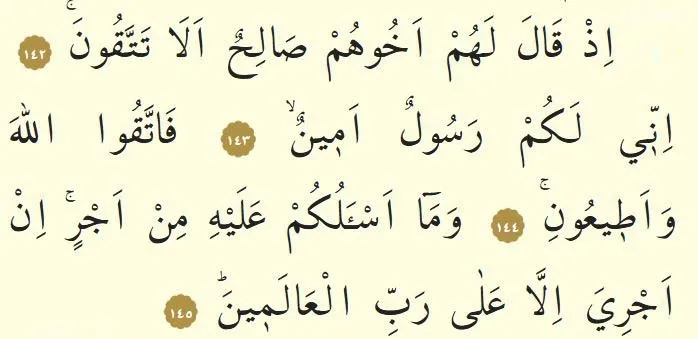 Hz. Salih'ten (as.) ve Semûd kavminden bahsedilen Şuara Suresi'nin 142-143-144-145. ayetinin okunuşu şöyle: