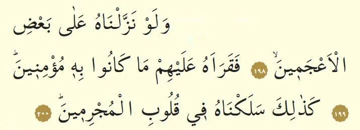 198-199. Ayet: Biz onu Arapça bilmeyenlerden birine indirseydik ve o da bunu kendilerine okusaydı yine buna inanmazlardı.