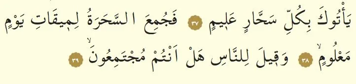 Şuara Suresi'nin 37-38-39. ayetinin tefsirine bakıldığında, 37. ayette; Firavun'un şehirlere adamlar göndererek en yetenekli sihirbazları toplamaları için emir verdiği görülür. 38. ayette; Firavun'un emir verdiği sihirbazlar, en iyi sihirbazları toplamak üzere harekete geçerler. 39. ayette ise sihirbazlar belirli bir günde toplanarak büyük bir gösteri hazırlarlar. Bu ayetler, Firavun'un Hz. Musa'nın (as.) mucizelerini sihir olarak nitelendirip karşı koymak için yaptığı hazırlıkları anlatır.