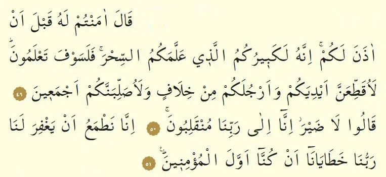 49.Ayet: Kale amentüm lehu kable en azene leküm innehu le kebirukümüllezı allemekümüs sıhr fe le sevfe ta'lemun le ükattıanne eydiyeküm ve ercüleküm min hılafiv ve la üzallibenneküm ecmeıyn