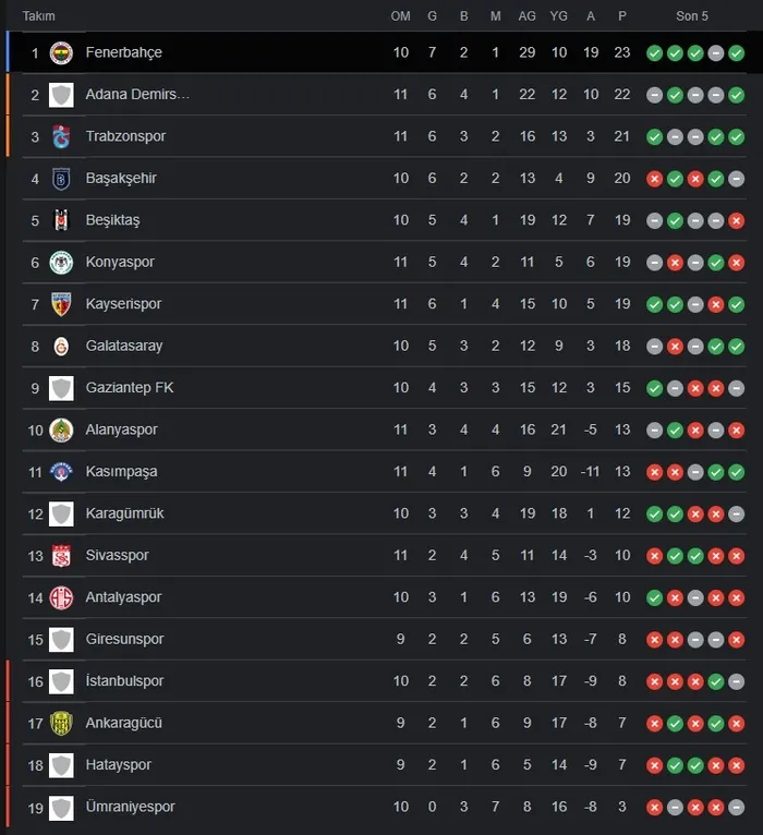 Türkiye Futbol Federasyonu (TFF) ile güncel Süper Lig Puan Durumu Tablosu ve 11. Hafta maç sonuçları - kalan maçlar detayları şöyle;