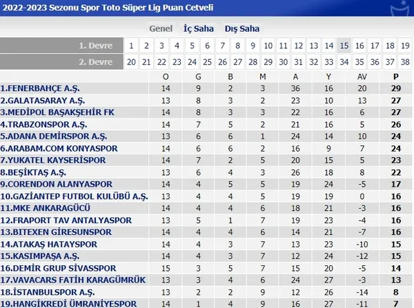 TFF ile Süper Lig Puan Durumu sıralama tablosu ve detaylar şöyle;