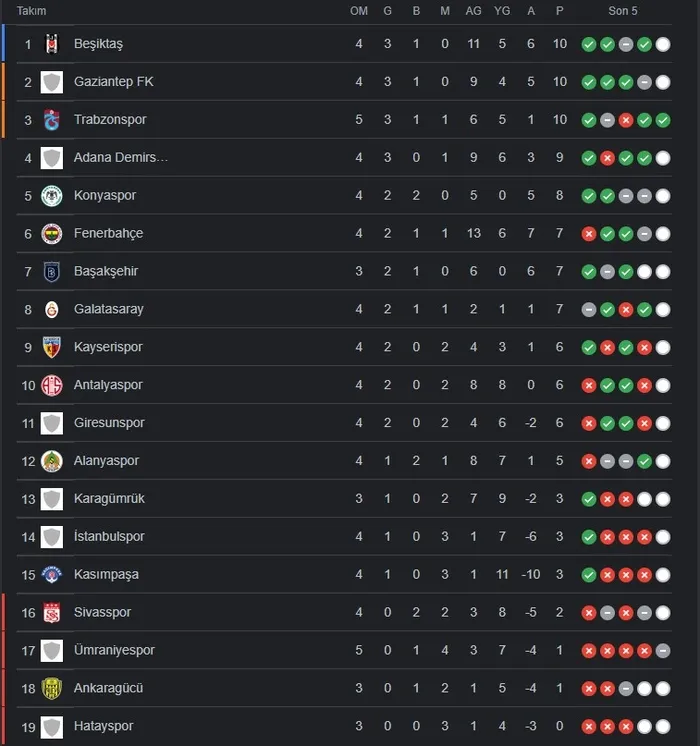 TFF ile 2 Eylül Süper Lig Puan Durumu Tablosu ve tüm detaylar şöyle;