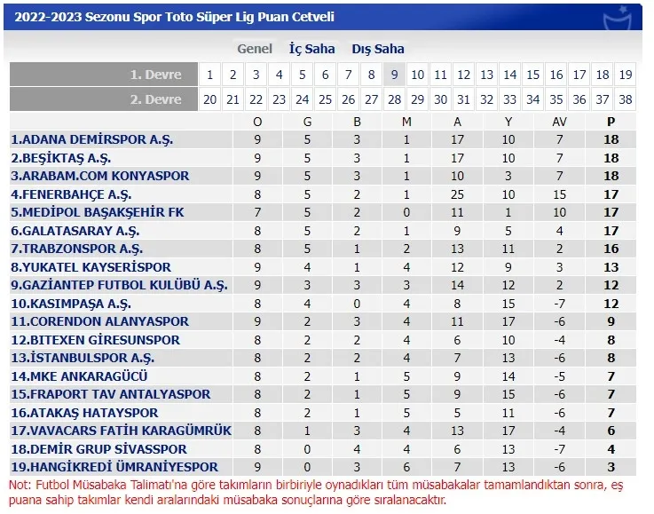 Süper Lig Puan Durumu Tablosu ve 9. Hafta maç sonuçları ilen kalan maçlar bilgileri şöyle;