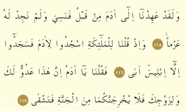 (117) "Bunun üzerine "Ey Âdem!" dedik, "Bil ki bu senin de eşinin de düşmanıdır. Sakın sizi cennetten çıkarmasın, yoksa mutluluğunu yitirirsin!"