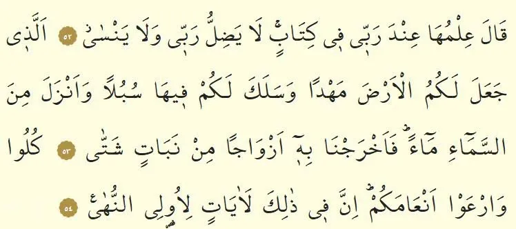 54.Ayet: Kendiniz yiyin, hayvanlarınızı da otlatın. Kuşkusuz bunlarda akıl sahiplerinin çıkaracağı dersler vardır.