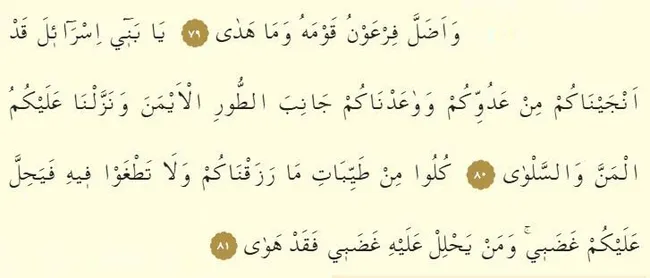 81. "Size rızık olarak verdiğimiz şeylerin temiz ve helal olanlarından yiyin. Bu konuda aşırı da gitmeyin, yoksa üzerinize gazabım iner. Gazabım da kimin üzerine inerse o muhakkak helak olmuş demektir."