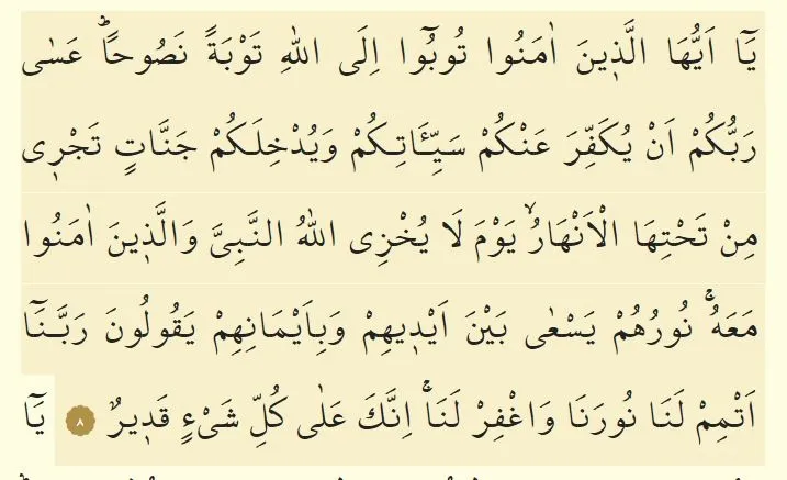 Yâ eyyuhâ-lleżîne âmenû tûbû ila(A)llâhi tevbeten nasûhan 'asâ rabbukum en yukeffira 'ankum seyyi-âtikum ve yudḣilekum cennâtin tecrî min tahtihâ-l-enhâru yevme lâ yuḣzi(A)llâhu-nnebiyye velleżîne âmenû me'ah(u)(s) nûruhum yes'â beyne eydîhim vebi-eymânihim yekûlûne rabbenâ etmim lenâ nûranâ vaġfir lenâ(s) inneke 'alâ kulli şey-in kadîr(un).