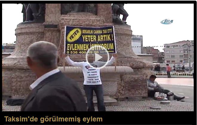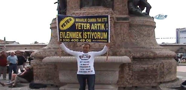 Eylemlerin ve protestoların yasaklandığı Taksim Meydanı tarihinde görülmemiş bir eyleme sahne oldu. Bekarlık canına tak eden bir kişi evlenmek için pankartlı eylem yaptı.