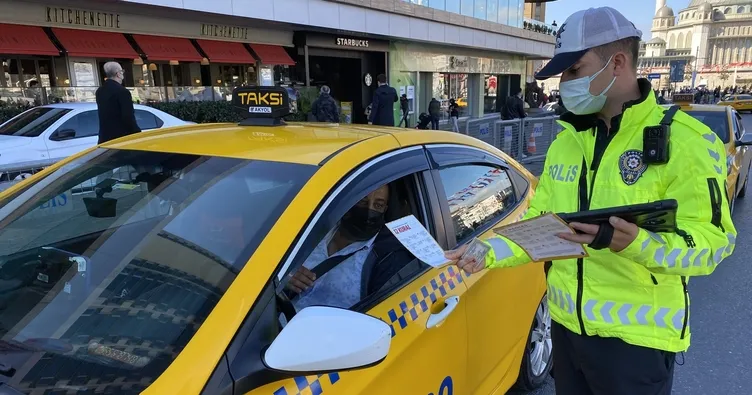 Trafik polislerince Taksim Meydanı'nda taksi sürücülerine yönelik denetim gerçekleştirildi. Taksilerdeki maske, mesafe ve hijyen kontrolünün yapıldığı denetimlerde, sürücülerin evrakları incelendi. Öte yandan, denetimlerde sürücülere, İçişleri Bakanlığınca hazırlanan ve içerisinde sürücülerin uyması gereken 12 kuralın yazılı olduğu broşür dağıtıldı.