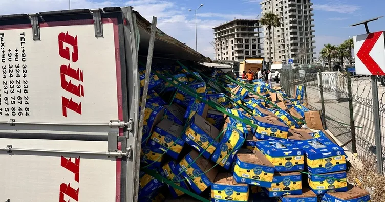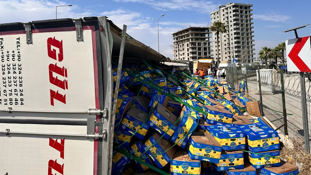 Alınan bilgiye göre D-400 karayolu üzeri yeni Devlet Hastanesi kavşağında 33 DHA 88 plakalı muz yüklü tır virajı alamayarak devrildi. Kazada ilk belirlemelere göre yaralanan olmadı, ancak muz dolu kutular etrafa saçıldı.