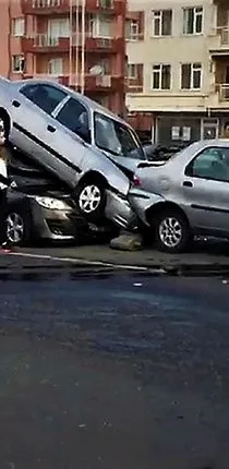 7 aracın birbirine girdiği kazada araçlardan birinin çarpışmanın etkisiyle önündeki otomobilin üstüne çıkması görenleri şok etti. Kazayla ilgili soruşturma başlatıldı.