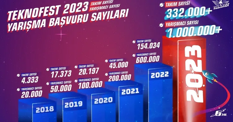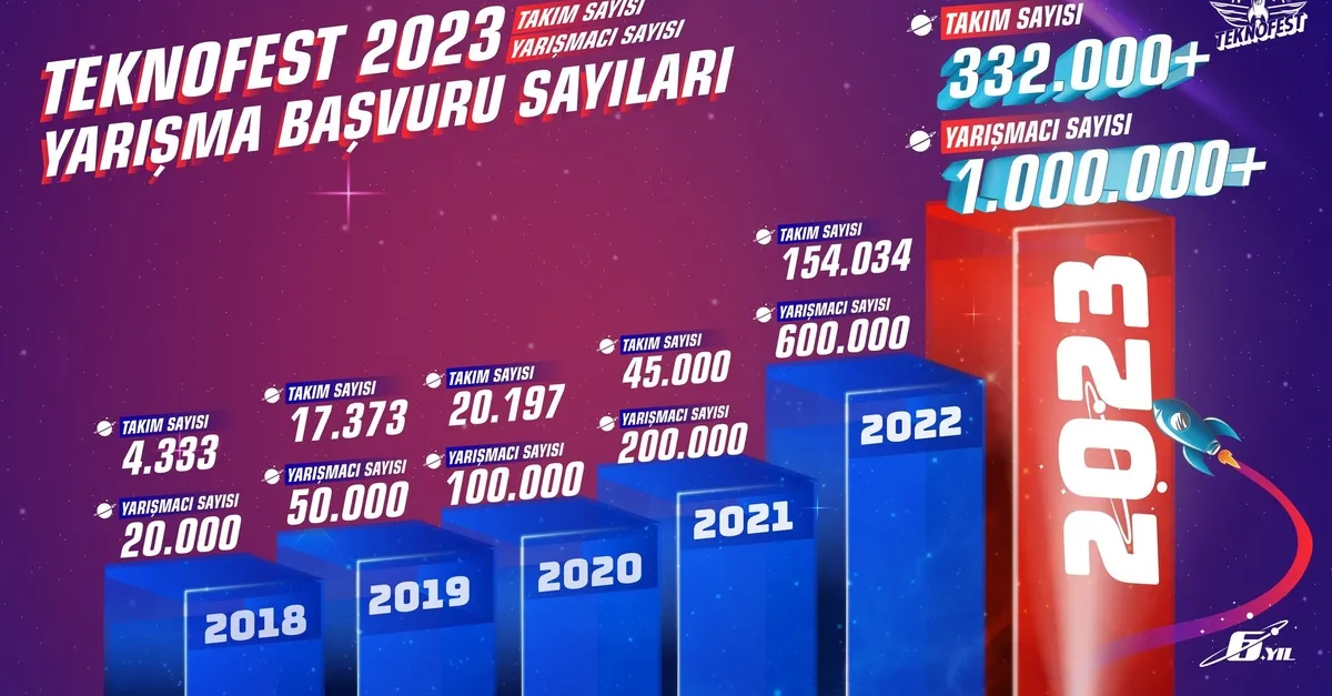'Milli Teknoloji Hamlesi' vizyonuyla hayallerini gerçeğe dönüştürmek isteyen tüm teknoloji tutkunlarını bir araya getirecek TEKNOFEST2023' başvuran takım ve yarışmacı sayıları belli oldu. 27 Nisan-1 Mayıs tarihleri arasında İstanbul Atatürk Havalimanı'nda düzenlenecek TEKNOFEST2023'e bu yıl 332 bin takım ve 1 milyon yarışmacı başvuruda bulundu. TEKNOFEST Yönetim Kurulu Başkanı Selçuk Bayraktar, twitter hesabından yaptığı paylaşımda TEKNOFEST2023'e başvuran takım ve yarışmacı sayılarının belli olduğunu belirterek " 332.000 takım ve 1.000.000'dan fazla yarışmacımız ülkemiz ve insanlığın geleceği için yarışmalara başvurdular ve proje ürettiler "açıklamasında bulundu