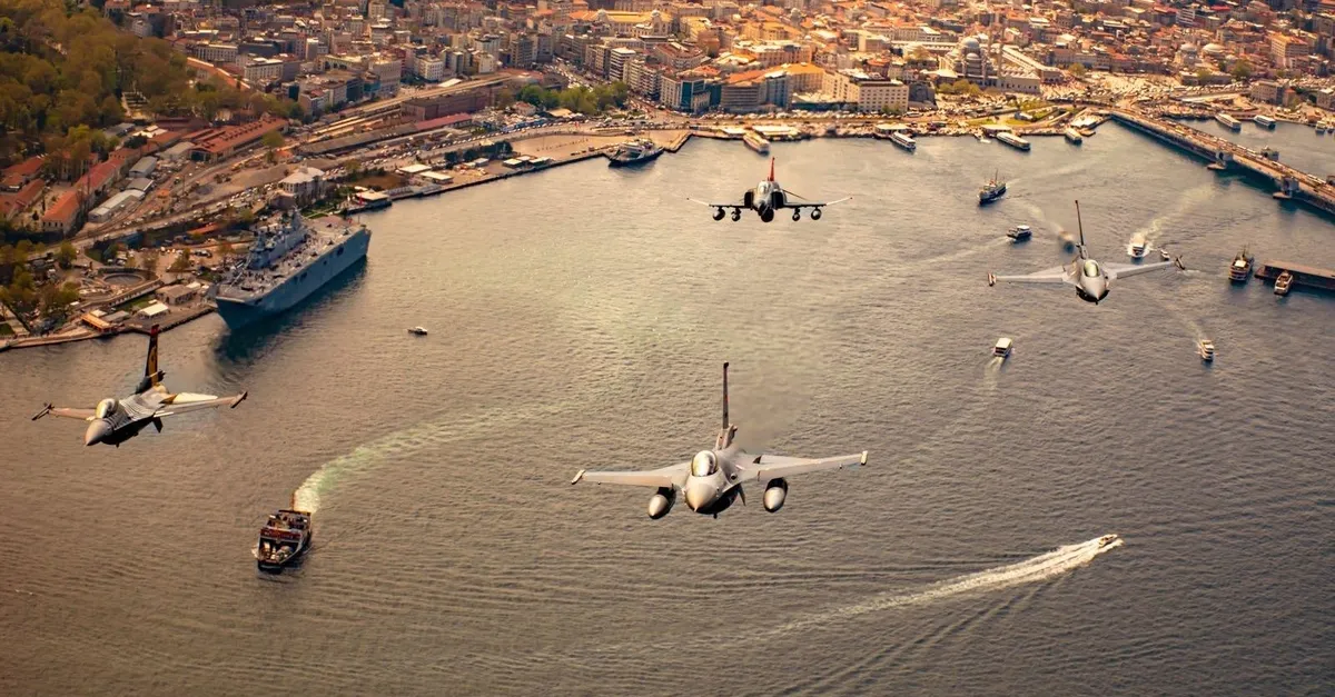 Türk Hava Kuvvetleri, TEKNOFEST kapsamında İstanbul üzerinde selamlama uçuşu gerçekleştirdi. Milli Savunma Bakanlığı'nın paylaştığı bir fotoğrafta, Sarayburnu'nda bağlı olan TCG Anadolu gemisi de yer aldı.