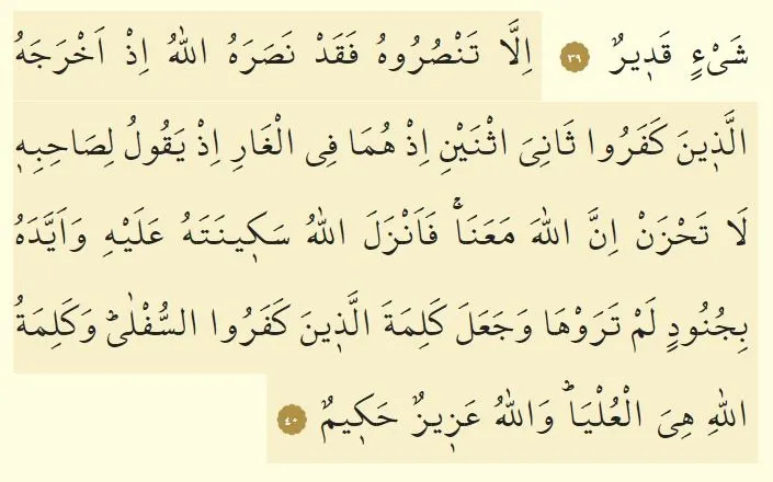 İlla tensuruhu fe kad nesarahullahu iz ahracehullezîne keferu saniyesneyni iz huma fil ğayri iz yekul li sahîbihî la tahzen innallahe meana fe enzelellahu sekînetehu aleyhi ve eyyedehu bi cunudil lem teravha ve ceale kelimetellezîne keferus sufla ve kelimetullahi hiyel ulya vallahu azîzun hakîm