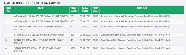 Çevre, Şehircilik ve İklim Değişikliği Bakanlığından, ilk kuraların Şırnak ve Ardahan'da çekileceği, kuraların, noter huzurunda gerçekleştirileceği ve canlı yayımlanacağı bilgisi verildi. Bugün Şırnak'ta bin 450, Ardahan'da 250 konut için kura çekimi yapılacak. Yarın Kars'ta bin 70, Siirt'e ise 903 konutun kura çekimi gerçekleştirilecek. Şanlıurfa'daki 7 bin 100 konut için 13-14-15 ve 16 Kasım'da kura çekimi yapılacak. 12 ilin kura takviminin belirlenmesinin ardından diğer illerdeki kura tarihlerinin de haftalık olarak açıklanması planlanıyor.