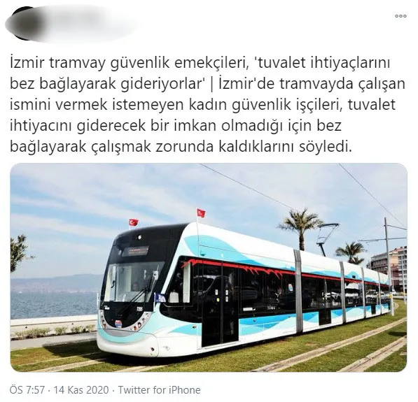 Bir Twitter kullanıcısı, tramvay istasyonlarında yaşanan skandalı sosyal medyaya taşıyarak "İzmir tramvay güvenlik emekçileri, 'tuvalet ihtiyaçlarını bez bağlayarak gideriyorlar' İzmir'de tramvayda çalışan ismini vermek istemeyen kadın güvenlik görevlileri, tuvalet ihtiyacını giderecek bir imkan olmadığı için bez bağlayarak çalışmak zorunda kaldıklarını söyledi. Kadın güvenlik görevlileri, tramvay çevresinde tuvalet ihtiyaçlarını gideremediklerini, mesaiden tüm gün içinde ayrılmalarının yasak olduğunu bu yüzden de tuvalet ihtiyaçları için bez kullanmak zorunda kaldıklarını bildirirken Metro Genel Müdürlüğü'ne durumu ilettiklerini söyledi. Güvenlik personeli, hiç bir yetkilinin şikayetlere kulak asmadığını söyledi." ifadelerine yer verdi.