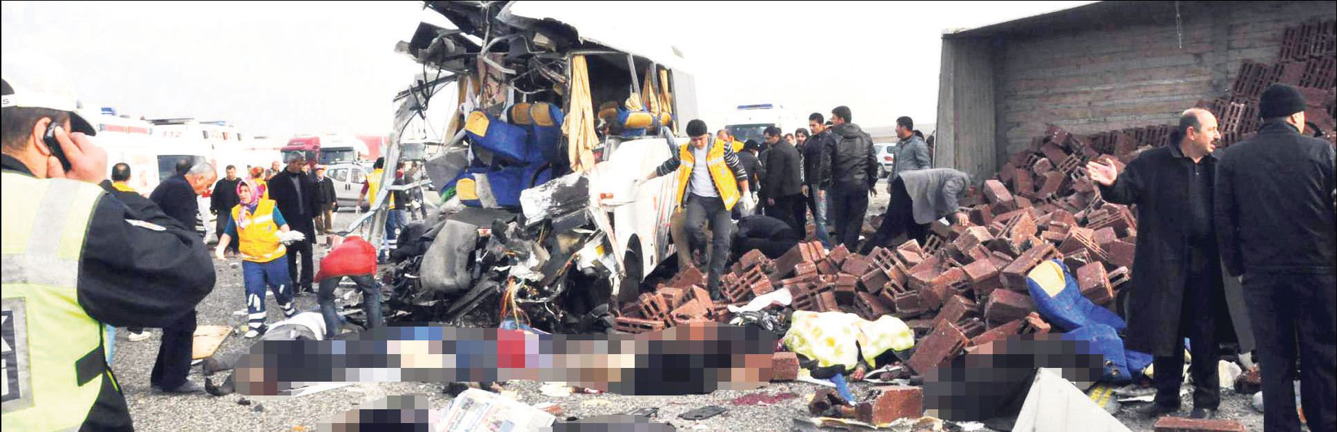Diyarbakır'da yol çalışması yapıla noktada tuğla yüklü TIR ile yolcu midibüsünün çarpıştığı kazada iki araç da hurdaya döndü. Kaza yerinin savaş alanına döndüğü kazada 25 kişi hayatını kaybetti. 13 yaralı, ambulanslarla Batman ve Diyarbakır'daki hastanelerde tedavi altına alındı. Kaza dün 13.30 sıralarında Bismil ilçesi yakınında meydana geldi. Diyarbakır'dan Siirt'e doğru yola çıkan ve tüm koltukları dolu olan midibüs, Salat köyü yakınlarına geldiğinde, bölünmüş yoldaki çalışma nedeniyle karşı şeride geçti. Karşı yönden gelen tuğla yüklü TIR, hatalı sollama yapınca hızla gelen midibüsle kafa kafaya çarpıştı. Kazayla birlikte midibüsün önü parçalandı, yolcular yola savruldu. Yan yatan TIR'daki tuğlalar da yola ve cesetlerin üzerine devrildi.