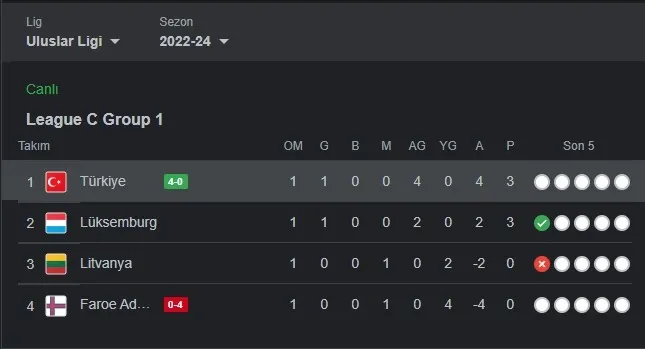 A Milli Futbol Takımımız, UEFA Uluslar C Ligi 1. Grupta Faroe Adaları ile yeşil sahada kozlarını paylaştı. Kıran kırana mücadelenin hakim olduğu maçta Ay yıldızlı millilerimiz 4-0'lık farklı skorla ilk maçından galibiyetle ayrıldı. Maçın ardından (milli takım) Türkiye puan durumu tablosunu merak eden futbolseverler yoğun olarak "UEFA Uluslar Ligi C grubu (Milli Takım) Türkiye kaçıncı sırada, puanı kaç?" sorularına yanıt arıyor.
