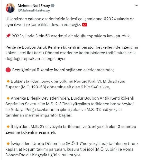 Bakan Ersoy, sosyal medya hesabından yaptığı açıklamada, "Ülkemizden çalınan eserlerimizin iadesi çalışmalarına 2024 yılında da aynı özveri ve kararlılıkla devam edeceğiz. 2023 yılında 3 bin 59 eserimizi ait olduğu topraklara kavuşturduk. Perge ve Boubon Antik Kentleri kökenli imparator heykellerinden Zeugma kökenli stel ile Urartu Dönemi eserlerine kadar binlerce tarihi miras artık doğduğu topraklarda sergileniyor" dedi.