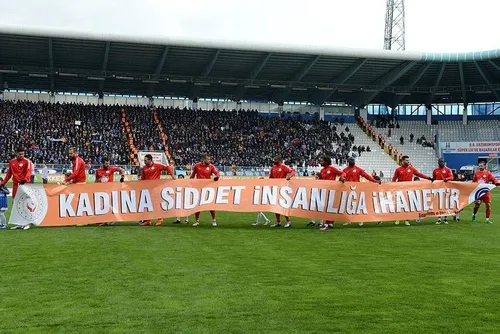 Dün oynanan Eskişehirspor - Ümraniyespor karşılaşmasına futbolcular Kadına Şiddete Hayır pankartı ile çıktılar.