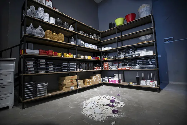 Dün ilk defa tekrar girdim mağazaya. Gördüğünüz gibi, çok şükür kırılan, dökülen ufak tefek ürünlerimiz var ama genel olarak sağlam. Yemek takımlarının setlerinden birkaç parça tabak düşmüş, bir iki tane fincan tabağım düşmüş, onun haricinde bir şey yok şu an için."