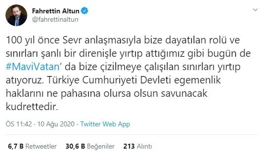 Cumhurbaşkanlığı İletişim Daire Başkanı Fahrettin Altun, Twitter hesabından "Mavi Vatan'da çizilmeye çalışılan sınırları asla tanımıyoruz, Türkiye Cumhuriyeti Devleti egemenlik haklarını ne pahasına olursa olsun savunacak kudrettedir." dedi.
