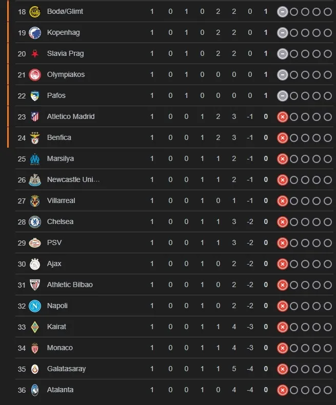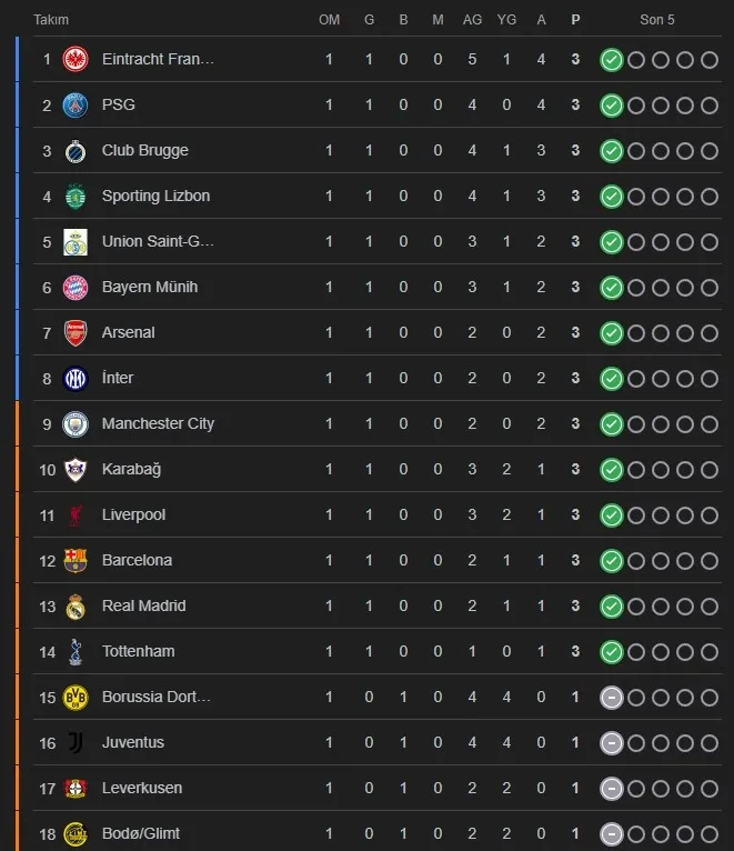 Eintracht Frankfurt, Galatasaray'ı 5-1 mağlup ederek grup liderliğini ilan etti. PSG ise Atalanya'yı 4-0 yenerek 3 puanla ikinci sırada yer aldı. Sporting CP ve Union Saint-Gilloise de galip gelerek 3 puanla başladılar.