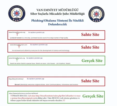 Edinilen bilgiye göre, Van Emniyeti Siber Suçlarla Mücadele Şube Müdürlüğü görevlilerince Uluslararası alanda bilimsel içerikli yayın yapan WEB sitelerinin kaynak kodlarının kopyalanarak phishing / oltalama yöntemiyle sahte web siteleri oluşturulduğu belirlendi