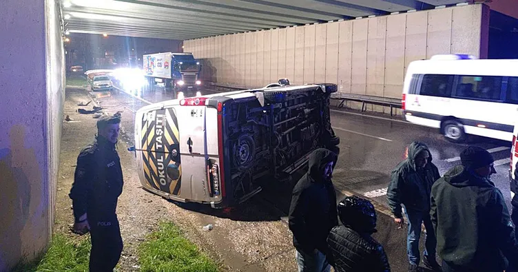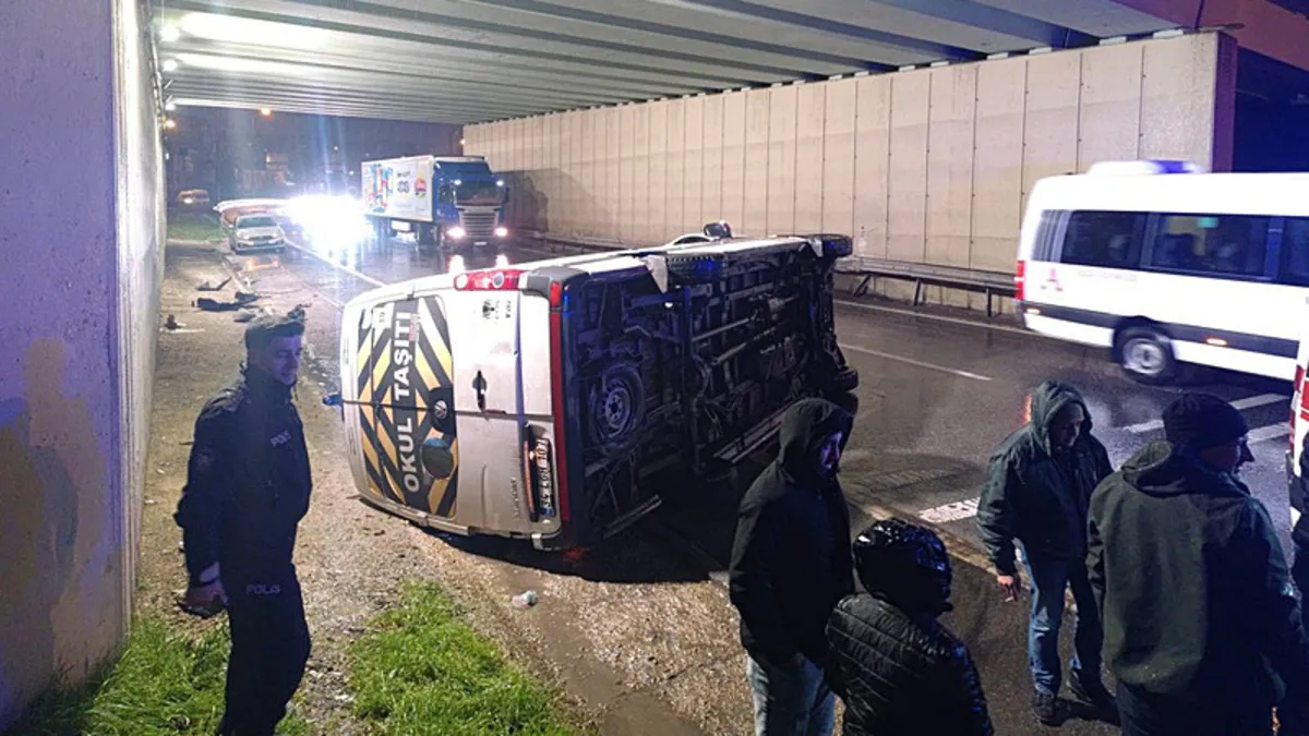 Şile Yolu Tepeüstü kavşağında 34 LGH 107 plakalı servis minibüsü, yağışın etkili olduğu yolda kontrolden çıkarak devrildi.