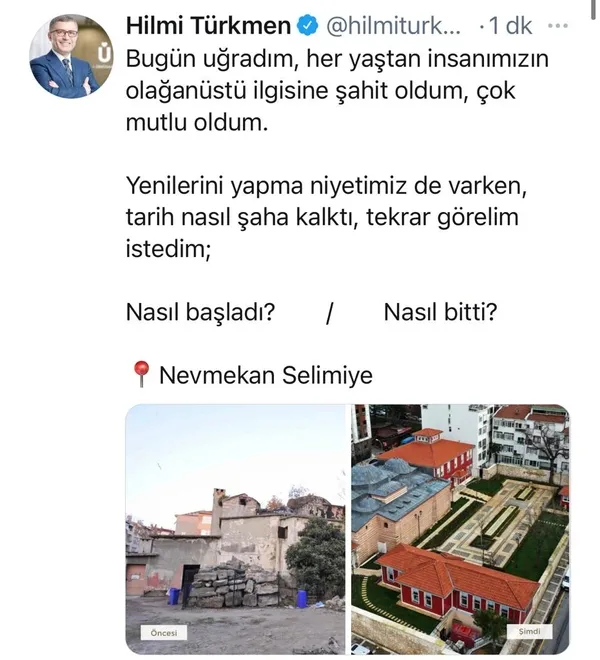 Üsküdar Belediye Başkanı Hilmi Türkmen, sosyal medya hesabından Nevmekan Selimiye hakkında bir paylaşım yaptı. Türkmen, "Nasıl başladı?", "Nasıl bitti?" diyerek öncesi ve sonrasını gösteren fotoğrafları takipçilerine sundu. Üsküdar Belediye Başkanı Hilmi Türkmen, "Bugün uğradım, her yaştan insanımızın olağanüstü ilgisini gördüm, çok mutlu oldum. Yenilerini yapma niyetimiz de varken, tarih nasıl şaha kalktı, tekrar görelim istedim; Nasıl başladı? / Nasıl bitti?" ifadelerini kullandı.