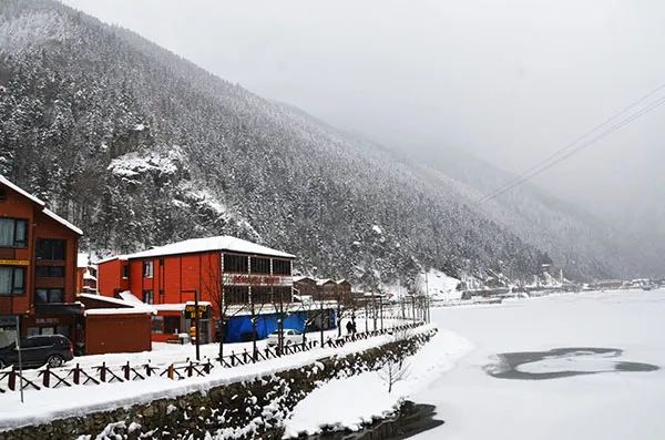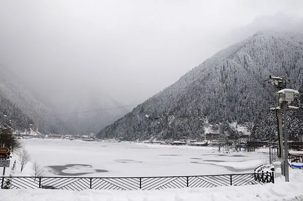 Uzungöl'de kar yağışının etkisiyle, göl buz tuttu.