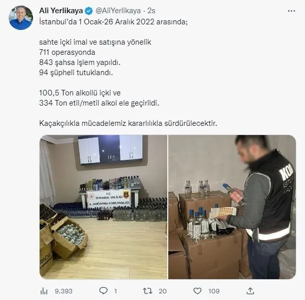 İstanbul Valisi Ali Yerlikaya, kentte 1 Ocak-26 Aralık 2022 tarihleri arasında yapılan sahte içki operasyonları hakkında açıklama yaptı. Vali Yerlikaya sosyal medya hesabından yaptığı açıklamada, "İstanbul'da 1 Ocak-26 Aralık 2022 arasında; sahte içki imal ve satışına yönelik 711 operasyonda 843 şahsa işlem yapıldı. 94 şüpheli tutuklandı. 100,5 Ton alkollü içki ve 334 Ton etil/metil alkol ele geçirildi. Kaçakçılıkla mücadelemiz kararlılıkla sürdürülecektir" bilgilerini verdi.