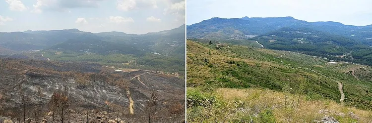 Denizli, Muğla, İzmir, Çanakkale, Balıkesir, Kütahya ve Antalya'nın çeşitli bölgelerinde, geçmiş yıllarda meydana gelen yangınlarda zarar gören ormanlık alanlardaki değişim, Orman Genel Müdürlüğünün paylaştığı fotoğraflarda gözler önüne serildi.