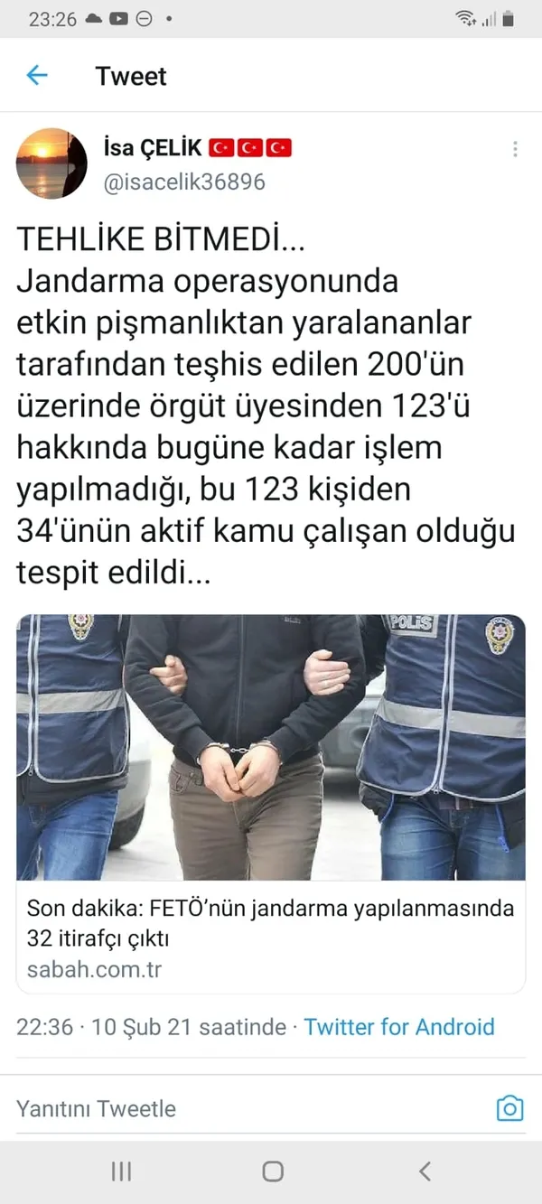 İsa Çelik twitinde, "Jandarma operasyonunda etkin pişmanlıktan yaralananlar tarafından teşhis edilen 200'ün üzerinde örgüt üyesinden 123'ü hakkında bugüne kadar işlem yapılmadığı, bu 123 kişiden 34'ünün aktif kamu çalışan olduğu tespit edildi..." dedi.