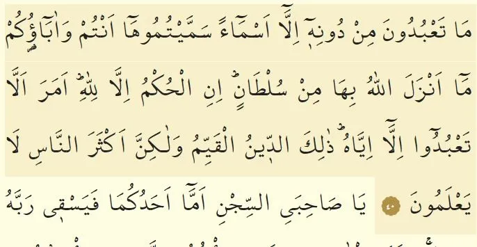 Ma ta'büdune min dunihı illa esmaen semmeytümuha entüm ve abaüküm ma enzelellahü biha min sültan inil hukmü illa lillah emera ella ta'büdu illa iyyah zaliked dınül kayyimü ve lakinne ekseran nasi la ya'lemun