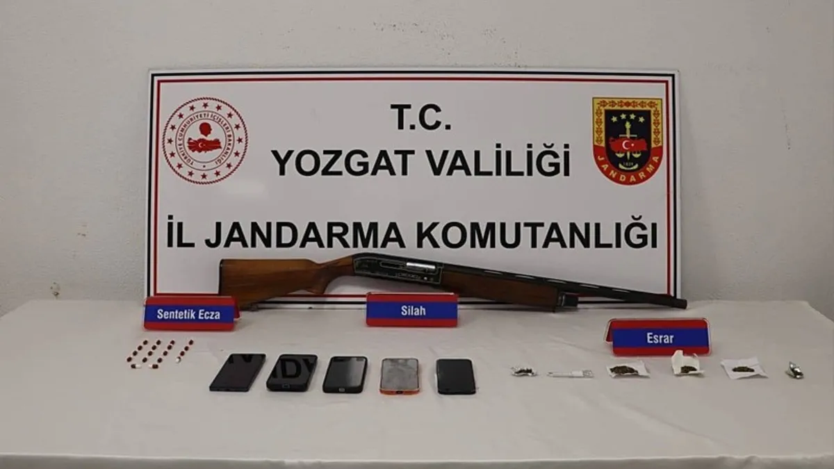 Yozgat ve Ankara'da düzenlenen uyuşturucu operasyonunda 5 şüpheli gözaltına alındı. İl Jandarma Komutanlığı ekipleri, Akdağmadeni Cumhuriyet Başsavcılığının koordinesinde uyuşturucu satıcılarına yönelik çalışma yürüttü. Ankara ile Akdağmadeni ilçesinde belirlenen adreslere eş zamanlı düzenlenen operasyonda 5 zanlı yakalandı. Adreslerde yapılan aramalarda 10 gram esrar, 18 uyuşturucu hap, bir ruhsatsız av tüfeği ve 5 cep telefonu bulundu. Şüphelilerin jandarmadaki işlemleri sürüyor.