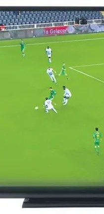 Yeşil çimen üstünde hareket eden yeşil formalı oyuncular, ekranda doğru dürüst görülmüyor.