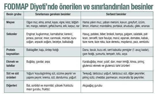 * Düşük FODMAP diyetinin diyetisyen gözetiminde uygulanması önerilir. Genellikle 6-8 hafta süresince uygulanır; daha sonra yasaklanan yiyecek ve içecekler diyete kademeli olarak eklenir.
