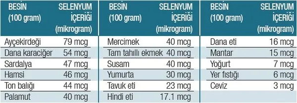 SELENYUMDAN ZENGİN DOĞAL BESİNLER: İnsanlarda selenyumun yüzde 28-40'lık büyük bir kısmı iskelet kasında depolanır. Selenyum birçok besinde doğal olarak bulunur. Balık, karides, dana karaciğeri, hindi, dana, tavuk eti, yumurta, süt ürünleri, mercimek, mantar, susam, ceviz, ay çekirdeği ve tam tahıllar iyi birer selenyum kaynağıdır.