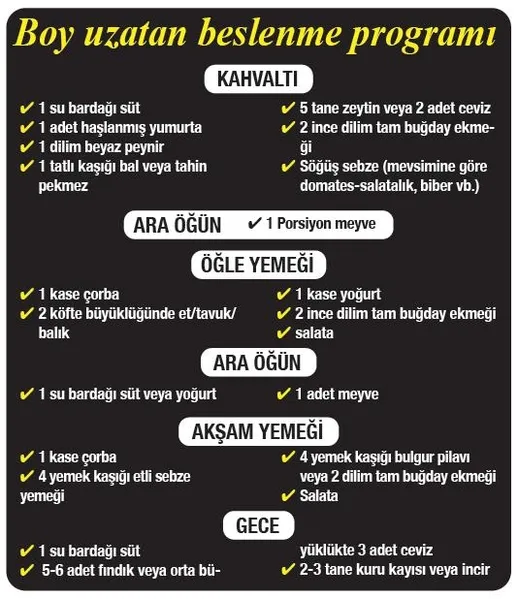 Ergenlik döneminde gençler diyet posası, vitamin, mineral ve antioksidanlarca zengin sebze ve meyvelerden her gün dört-beş porsiyon, kuru baklagilleri haftada en az iki porsiyon kadar tüketmelidir. Büyüme çağındaki çocuk ve gençlerin gerekli aminoasitleri içeren ve kaliteli protein olarak bilinen hayvansal kaynaklı besinleri yeterli miktarda tüketmeleri gerekir. Günlük üç-dört su bardağı süt, yoğurt gibi süt ürünleri, üç-beş köfte ölçüsü kadar kırmızı et, tavuk veya balık tüketmenin boy uzaması ve kas gelişimi için önemli olduğunu altını çizmek istiyorum.