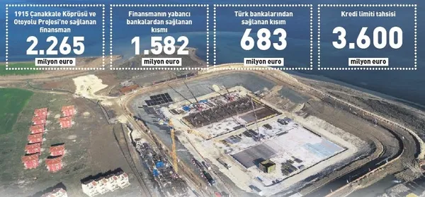Başbakan Binali Yıldırım, 18 Mart'ta ilk kazık çakılacak 1915 Çanakkale Köprüsü ve Otoyol Projesi'nin finansmanı için yabancı bankaların birbiriyle yarıştığını belirterek, "2.3 milyar euroluk finansmanın 1.6 milyarını aralarında Kore, Almanya, Fransa, İtalya, Birleşik Arap Emirlikleri, Kuveyt, Çin ve Danimarka'nın da bulunduğu 10 ülkeden 24 banka sağladı. Bu 1.6 milyar euroluk finansman için 3.6 milyar euroluk teklif geldi. Alamadıklarımız da gönül koydular" dedi. Kredinin Türkiye ekonomisinin gücünü gösterdiğini belirten Yıldırım, "Vadesi 5 yılı geri ödemesiz 15 yıl. Faizi de libor artı 1.45. Son yıllarda alınmış en uygun kredi" mesajı verdi.