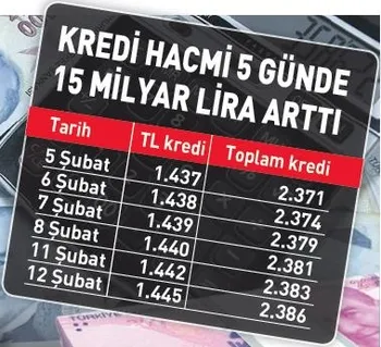 Bankaların kredi musluklarını açmaya başladığı BDDK'nın rakamlarında açıkça görülüyor. Geçen yılın son aylarında frene basan sektörün kredi hacmi şubat ayından bu yana yukarı ivmelenmeye başladı. 5 Şubat'ta 2 trilyon 371 milyar TL olan toplam kredi hacmi 5 günde 15 milyar artarak 2 trilyon 386 milyar TL'ye çıktı.