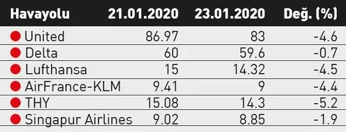 Virüs haberleri ortaya çıktığından bu yana özellikle Asya- Pasifik ülkelerinin ekonomileri için risk haline geldi. Sadece bunlarla kalsa iyi... ABD ve AB piyasaları da virüsün yayılması endişeleriyle düşüyor. En çok da havayolu ve turizm şirketleri bu düşüşten nasibini alıyor. İki günde United hisseleri yüzde 4.6, Delta 0.7, Lufthansa 4.5, AirFrance-KLM 4.4, THY 5.2, Singapur Airlines 1.9 düştü. Trip Advisor, Royal Caribbean gibi turizm şirketlerinin yanı sıra Çinli tüketicilerin en sevdiği Burberry, Hermes, LVMH gibi markaların hisseleri de azaldı.