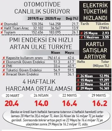 Pandemi sürecinde vatandaş eve kapanınca konutlarda elektrik tüketimi artmıştı. Fabrikalar üretime ara verdiği için sanayide tüketim verileri ise gerilemişti. Mayıs ortalarından itibaren fabrikalarda yeniden çarklar dönmeye başladı. Fabrikalar yüzde 80 kapasiteye kadar çıktı. Bu, elektrik tüketimini hızlandı. Kapasite kullanım oranlarında da artış başladı. Tüketici güven endeksi ve ihracat iklim endeksi arttı.