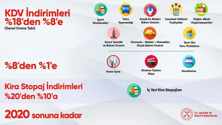 Pandemiden en çok etkilenen sektörlerden olan turizm ile doğrudan ve dolaylı olarak ilgili olan konaklama hizmeti, yeme-içme sektöründe verilen hizmetler ile sinema, tiyatro, opera, operet, bale ve müze giriş ücreti gibi kültürel faaliyetlerin yüzde 8 olan KDV oranları da yılsonuna kadar yüzde 1'e indirildi.
