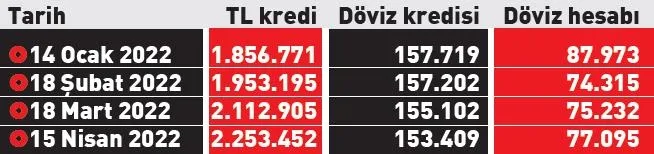 Döviz kredileri 157.7 milyar dolardan 153.4 milyar dolara geriledi. Döviz kredilerinde 4.3 milyar dolara yakın azalma oldu. Döviz kredileri azalırken döviz hesaplarında da 18 Şubat'tan itibaren artış yaşandı. 18 Şubat haftasında döviz hesapları 74.3 milyar dolar iken, 15 Nisan haftasında 77 milyar dolara çıktı.