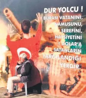 Orta yaşta bir adam... Ak saçlı... Belki şehit ya da gazi yakını... Tek başına oturuyor... Arkasında şu yazı: "Dur yolcu! Burası vatanını, namusunu, şerefini, haysiyetini 1 dolara satanların yargılandığı yerdir."