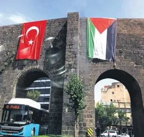 Filistin'de bomba patlıyor, Diyarbakır Kalesi'ne Türk ve Filistin bayrakları asılıyor.